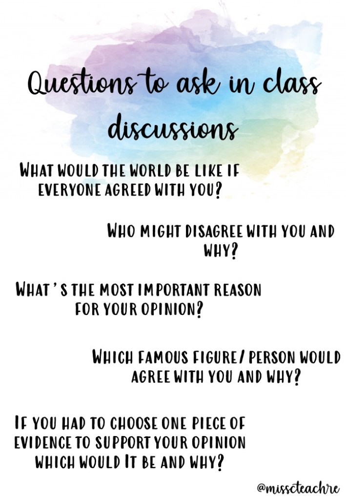 You can see that the questions progress from basic knowledge, through to considering different views (evaluation). You can differentiate by choosing which students you’ll ask which questions to (this is why I don’t have hands up). You can pre write some questions before the lesson (I used to do this before lesson observations as a trainee) if questioning does not come naturally.