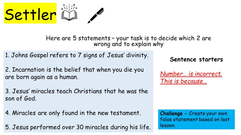 • Anticipate common errors/misconceptions and build this into your lesson. For example, learners will sometimes confuse incarnation with reincarnation in RE lessons. Planning in opportunities to address these misconceptions will provide another layer of support for learners. This can be done using lots of low stake quizzing, getting students to spot errors and correct them, or asking learners to explain why something is wrong. See below for an example in an RE lesson.