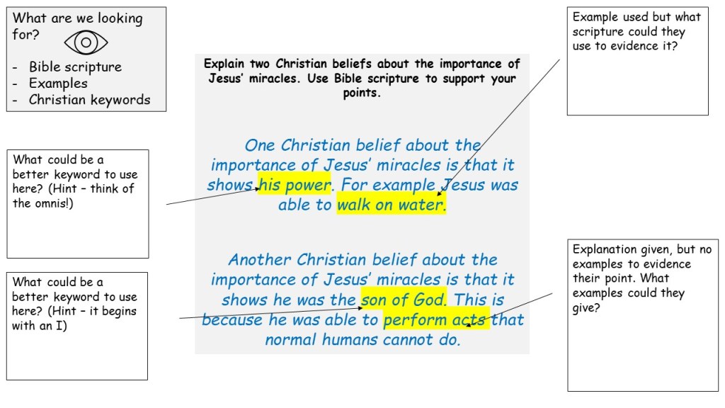 • Modelling answers and responses for learners that are both good and poor. Plan in time for students to improve answers, but scaffold this for learners. This could involve you as the teacher directing them towards keywords to include, some key evidence/examples to include, or where things could be developed. See below for some ideas of how to do this.