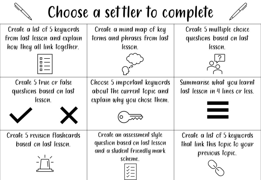 There is often a temptation to do ‘ice-breaker’ type activities, however they’ve probably done this in tutor periods or transition activities (year 7). Secondly if you have a year 10 class for example they probably already know each other. My advice is just get on with the learning! Some good ideas for starter tasks may be to…