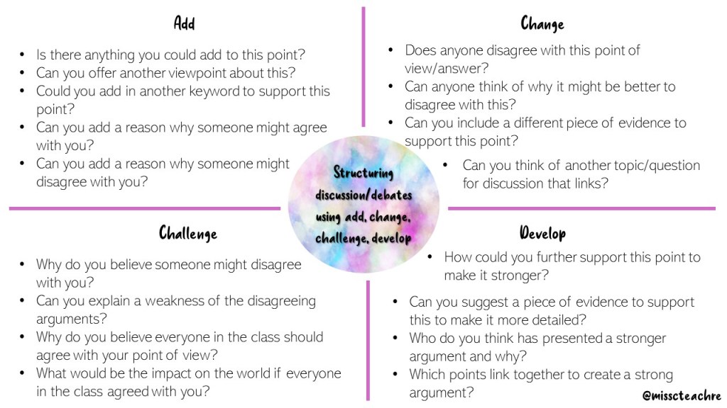 This is a strategy I picked up in my training year, it’s a great way to involve students in structured discussions and differentiation at the same time. Students can choose, or you can direct them to add, change, challenge or develop during questioning.