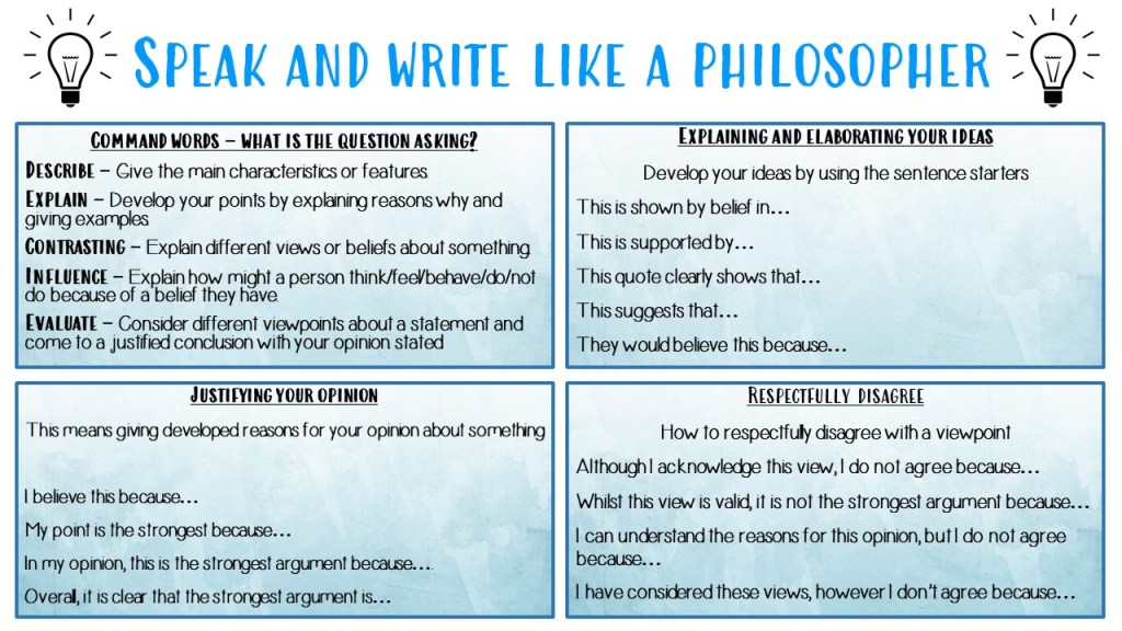 Develop – students can develop upon what another student has said (e.g. a piece of scripture to support Adam’s point is…)